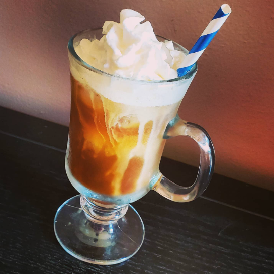 Kentucky Coffee! It's a joltingly delicious boozy brew to take the edge off a sultry summer Monday. Day 2 of the "21 Drink Salute to America" finds me adding a shot of Kentucky Bourbon to my glass of brewed coffee on ice, with a little Amaretto and a frothy, creamy top. Cheers!