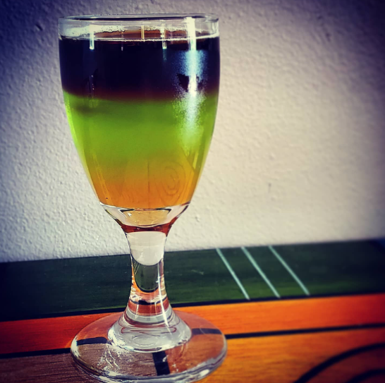 Behold, the Sexy Alligator: some nutty Amaretto, some sweet Midori melon liqueur mixed with pineapple juice, and a top layer of Jägermeister to give this 'gator its bite. It's Day 10 of the "21 Drink Salute," and this drink reminds me of the time I called my local Western outfitter to ask if they had any alligator boots. "You bet," came the reply, "what size does your alligator wear?" Cheers!